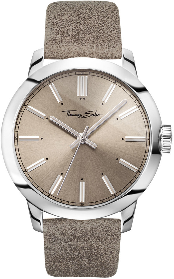 Thomas Sabo WA0313 Rebel at heart Men -rannekello retrotyylinen kokonaisuus. Ruostumattomasta teräksestä valmistetun rungon leveys on 46mm ja paksuus 12mm. Ruskean, vintage tyylisen nahkarannekkeen leveys kiinnityskohdasta on 22mm. Kellossa on kovetettu ja heijastamaton mineraalilasi, jossa on naarmuuntumaton safiirilasipinnoite. Koneistona kellossa on Japanilainen MIYOTA 2036 paristokoneisto. Laadukkaille Thomas Sabo rannekelloille myönnetään kahden vuoden takuu ja tuote toimitetaan valmistajan alkuperäisessä pakkauksessa.