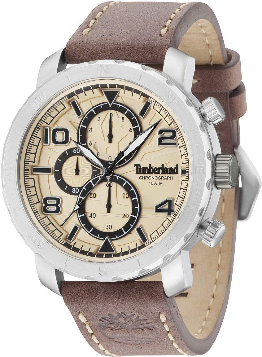 Timberland TBL14865XS/07 Norwood -kellossa on suuri hopeanvärinen runko ja beige kellotaulu. Kello on 100m vesitiivis ja siinä on ajanotto ominaisuus. Rungon leveys on 48 mm ja paksuus 11 mm. Ruskean nahkarannekkeen leveys kiinnityskohdasta on 24 mm. Laadukkaille Timberland kelloille myönnetään kahden vuoden takuu ja tuote toimitetaan valmistajan alkuperäisessä rasiassa.