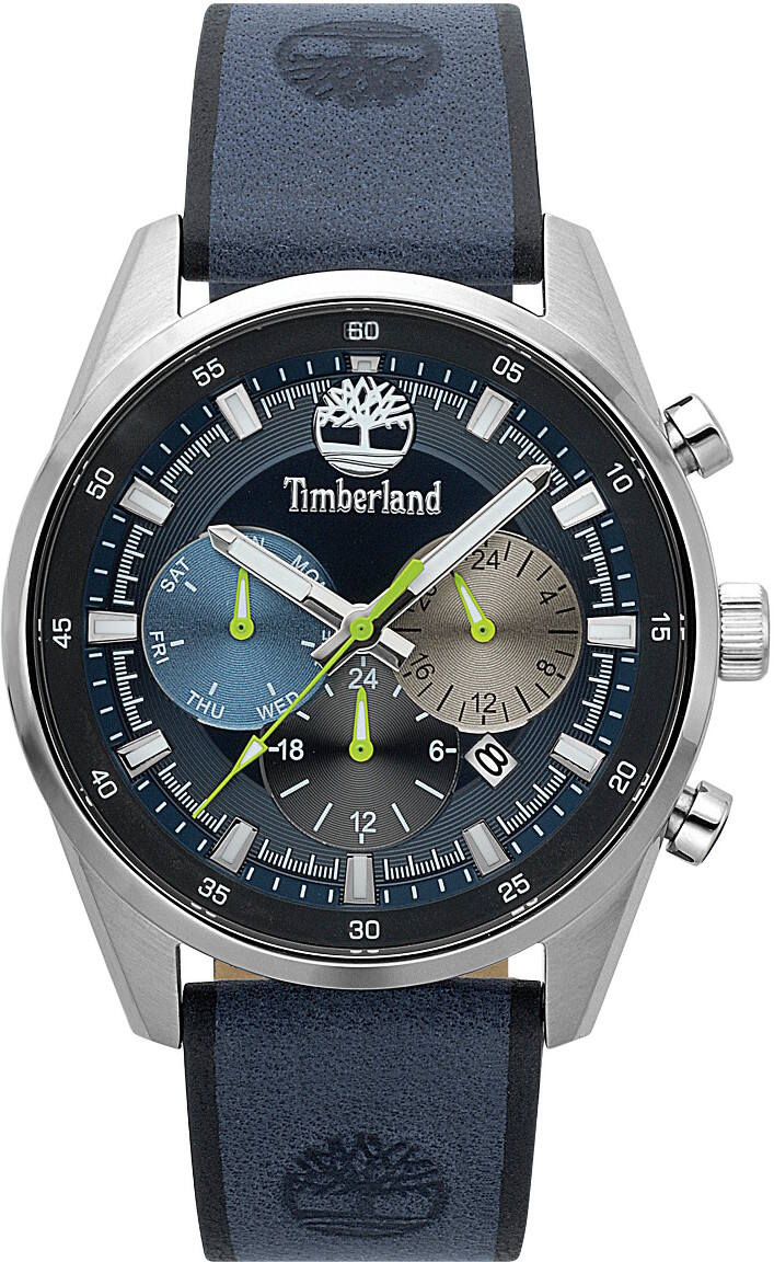 Timberland TBL15417JS/03 Chauncey tuo uutta ilmettä Timberland kelloihin. Kellossa on sininen nahkaranneke, hopeanvärinen runko ja sininen kellotaulu. Ominaisuuksina päivyri, viikonpäivänäyttö, 24h näyttö sekä kaksoisaika. Rungon leveys on 43mm ja paksuus 12mm. Rannekkeen leveys kiinnityskohdassa on 22mm. Timberland -kelloille myönnetään 2 vuoden takuu ja ne toimitetaan valmistajan alkuperäisessä pakkauksessa.