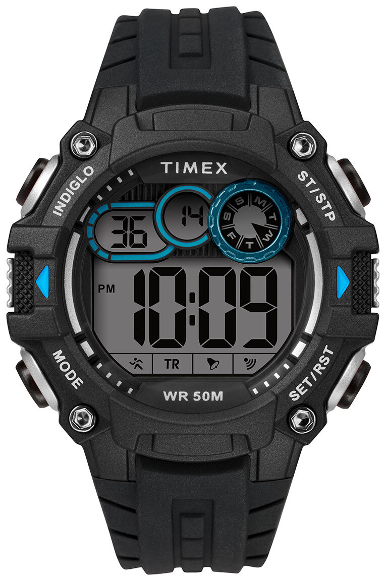 Timex DGTL TW5M27300 -kello on tyylikäs miesten rannekello. Sen musta 48 mm leveä runko on valmistettu hartsista. Timex TW5M27300 -rannekellossa on mukavan tuntuinen silikoniranneke, jonka leveys on kiinnityskohdasta 17 mm. Kellossa on hienot siniset yksityiskohdat. Ominaisuuksina mm. 24 tunnin näyttö, harmaa digitaalinäyttö, kirkas indiglo-jälkihohto, päivittäiset hälytykset, kaksoisaika, päivyri sekä kalenteri. Kello kuuluu 50 m -vesitiiviysluokkaan eli se on rajoitetusti vesitiivis. Timex-rannekelloilla on kahden vuoden takuu, ja ne toimitetaan valmistajan alkuperäisessä rasiassa.