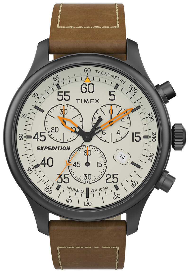 Timex Expedition TW2T73100 -kello on tyylikäs miesten kronografikello. Sen harmaa 43 mm leveä runko on valmistettu messingistä. Timex TW2T73100 -rannekellossa on mukava nahkaranneke, jonka leveys on kiinnityskohdasta 20 mm. Kellotaulua suojaa mineraalilasi. Ominaisuuksina mm. ajanotto, päivyri ja kirkas indiglo-jälkihohto. Kello kuuluu 100 m -vesitiiviysluokkaan eli se on vesitiivis ja soveltuu esim. uimiseen. Timex-rannekelloilla on kahden vuoden takuu, ja ne toimitetaan valmistajan alkuperäisessä rasiassa.