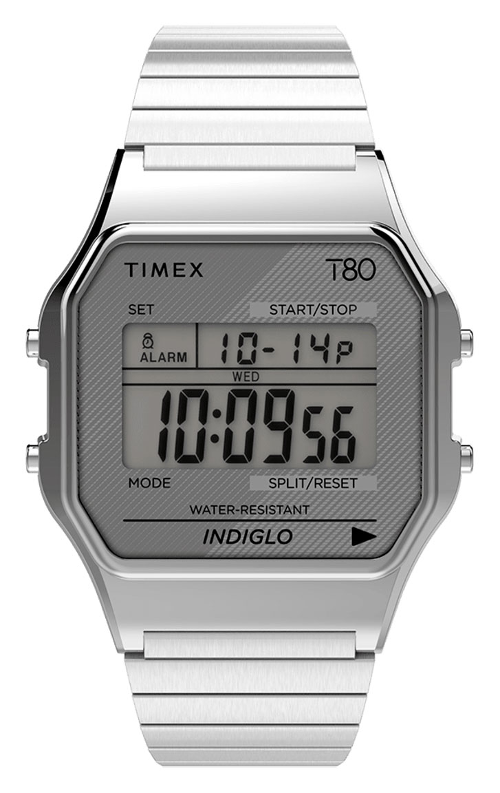 Timex T80 TW2R79100U8 on kuin katsoisi menneisyyteen. Timex halusi tuoda markkinoille uuden version heidän ensimmäisistä digitaalikelloistaan. T80-rannekellon muotoilu tuo ranteeseesi retrotyyliä ja sen ominaisuudet auttavat sinua arjessa. Ominaisuuksia ovat mm. harmaa digitaalinäyttö, ajanotto 1/100 sekuntia, päivittäiset hälytykset sekä päivyri. Hopea runko (34 mm) ja ranneke ovat valmistettu hartsista. Kellolasi on valmistettu akryylistä. Rannekkeessa ei ole erilistä lukitusta vaan se on kuin kuminauha, joka sopeutuu ranteeseesi. Kello kuuluu 30 m -vesitiiviysluokkaan eli se on roiskevesitiivis. Timex-rannekelloilla on kahden vuoden takuu, ja ne toimitetaan valmistajan alkuperäisessä rasiassa.