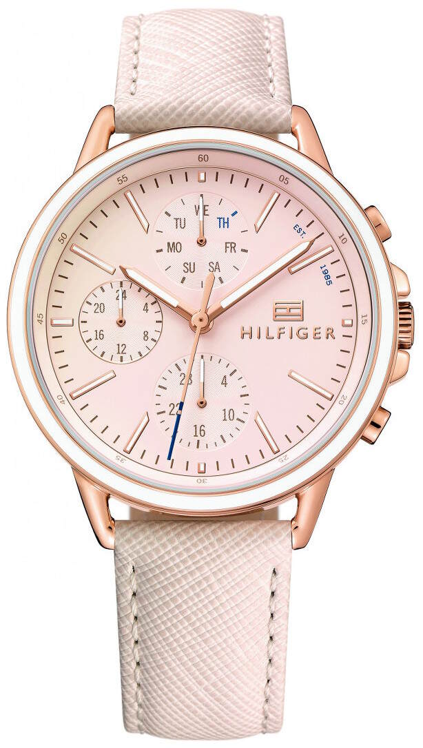 Tommy Hilfiger 1781789 Carly -kellossa on on pinkkiin taittava valkoinen nahkaranneke ja ruusukullan värinen runko. Ominaisuuksina viikonpäivänäyttö sekä päivyri. Kellon rungon leveys on 40mm ja paksuus 10mm. Rannekkeen leveys kiinnityskohdasta 18mm. Tommy Hilfiger kellot toimitetaan valmistajan alkuperäisessä pakkauksessa ja niille myönnetään kahden vuoden takuu.