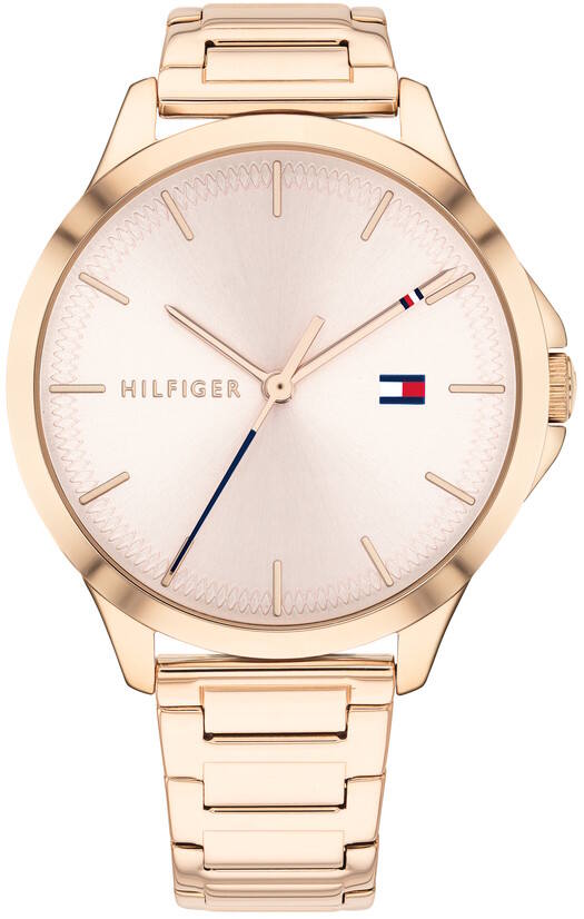 Tommy Hilfiger 1782087 Peyton -kellossa on vaaleanpunainen kellotaulu ja punakullan värinen runko sekä ranneke. Kellotaulussa on Hilfiger teksti sekä Hilfigerin logo. Kellon rungon halkaisija on 38mm ja paksuus 7,5mm. Rannekkeen leveys kiinnityskohdasta on 18mm ja rannekkeessa on käytännöllinen linkkulukko.