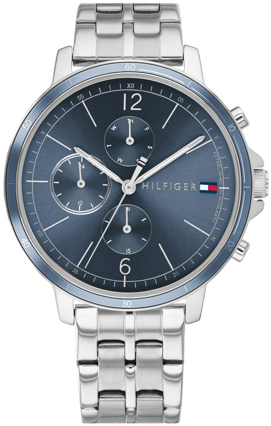 Tommy Hilfiger 1782188 Madison -kellossa on sininen kellotaulu, hopeanvärinen teräsranneke ja hopeanvärinen runko. Rungon leveys on 38 mm ja paksuus 8 mm. Rannekkeen leveys kiinnityskohdasta on 17 mm.