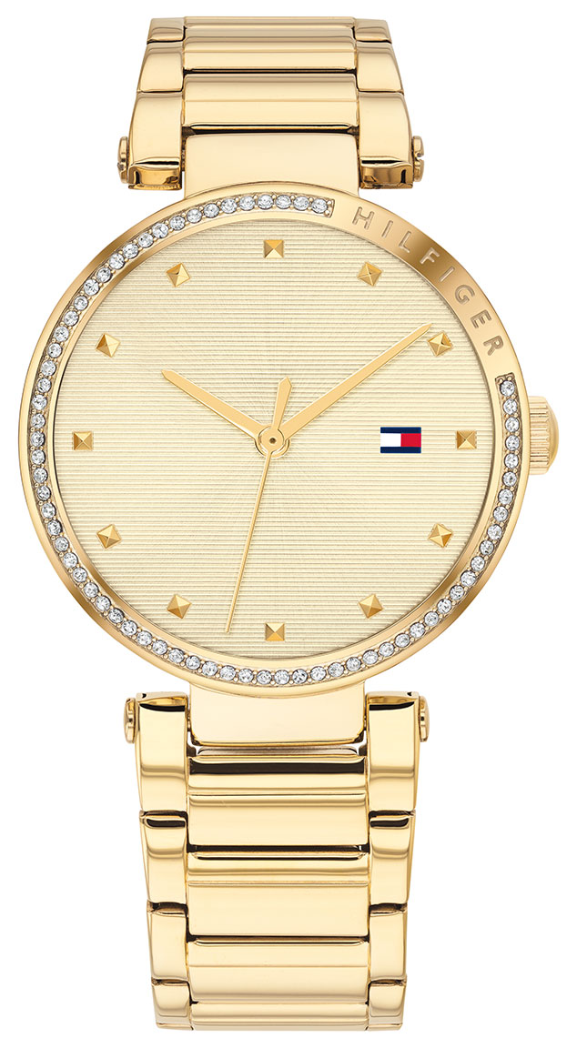 Tommy Hilfiger 1782235 Lynn -kellossa yhdistyvät kullan ja kristallin kimallus! Kellon runko ja ranneke ovat valmistettu kullanvärisestä ruostumattomasta teräksestä. Kellon taulua koristaa kellon ympärille ja indekseihin upotetut kristallit. Kellon rungon leveys on 32 mm ja paksuus 8,5 mm. Rannekkeen leveys kiinnityskohdasta on 18 mm. Tommy Hilfiger -kelloille myönnetään 2 vuoden takuu ja ne toimitetaan valmistajan alkuperäisessä rasiassa.