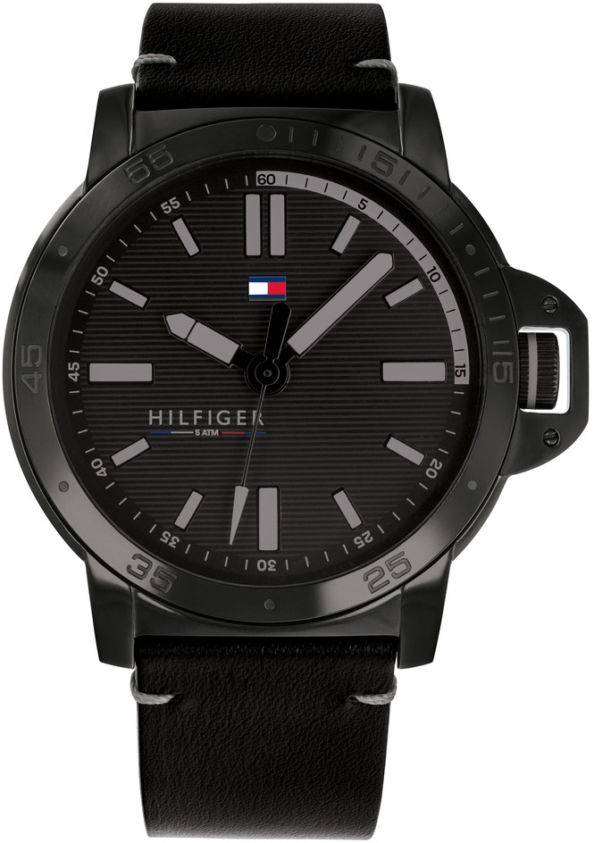 Kauttaaltaan musta Tommy Hilfiger 1791592 Men's Diver mukailee ulkonäöltään aitoa sukeltajankelloa. Teräksinen 44 mm runko kulkee kokonaan säätönupin yli luoden sille turvallisen pienen taskun kellon kylkeen. Tässä mallissa ranneke on 22 mm leveä ja valmistettu aidosta nahasta.