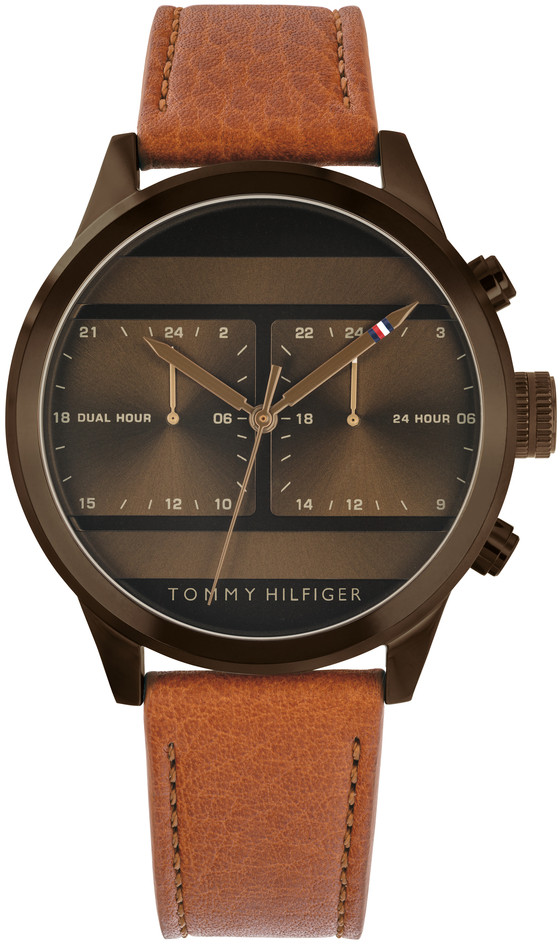 Tommy Hilfiger 1791594 Icon on nimensä mukaisesti uuden ajan tyyli-ikoni. Jännittävä tummanruskea kellotaulu tarjoaa mahdollisuuden kahden aikavyöhykkeen yhtäaikaiseen seuraamiseen. Kello on valmistettu ruostumattomasta teräksestä ja aidosta nahasta, sen rungon halkaisija on 44 mm ja rannekkeen leveys 21 mm.