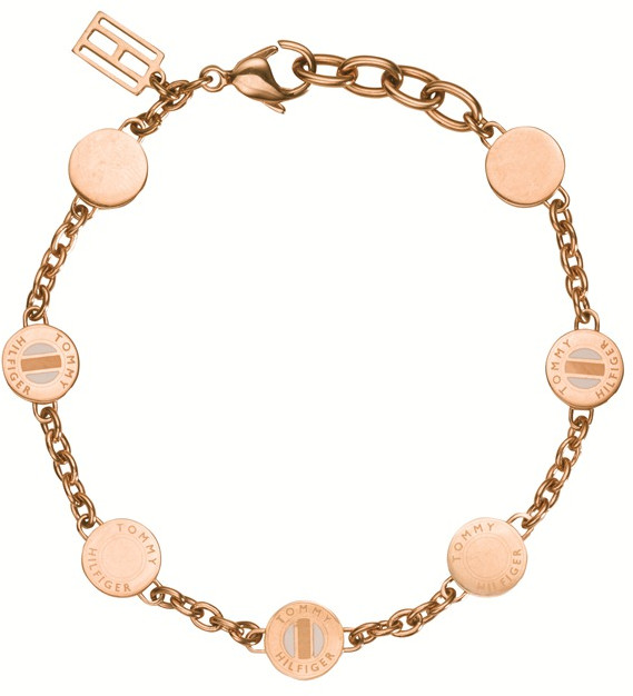 Naisten tyylikäs Tommy Hilfiger 2700473 rannekoru. Koru on valmistettu ruostumattomasta teräksestä ja on punakullan värinen. Korussa on 1,5cm välein pyöreitä yksityiskohtia, joissa on esim. Tommy Hilfigerin logo. Korun pituus on 19cm. Koru toimitetaan valmistajan alkuperäisessä rasiassa.