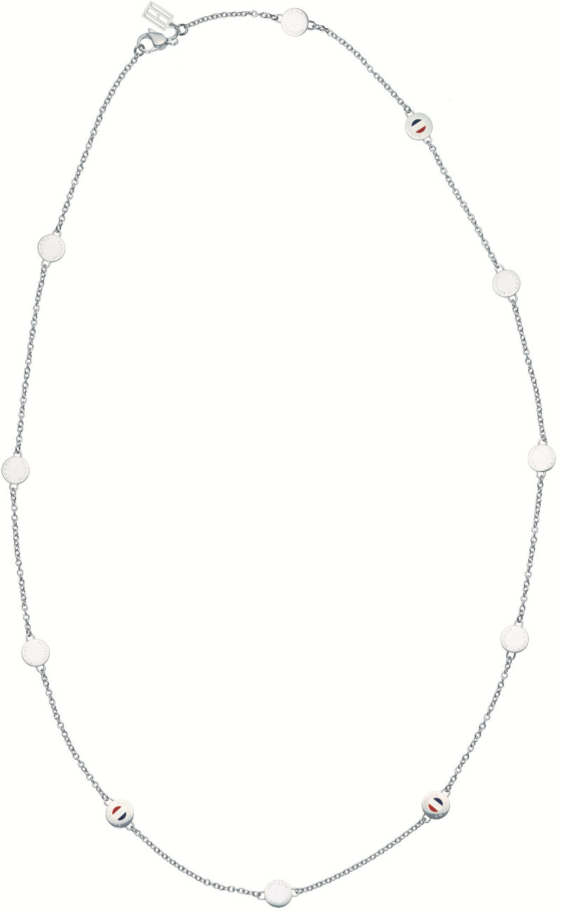Naisten tyylikäs Tommy Hilfiger 2700495 kaulakoru. Koru on valmistettu ruostumattomasta teräksestä ja on hopean värinen. Korussa on n. 3cm välein pyöreitä yksityiskohtia, joissa on esim. Tommy Hilfigerin logo. Korun pituus on 50cm. Koru toimitetaan valmistajan alkuperäisessä rasiassa.