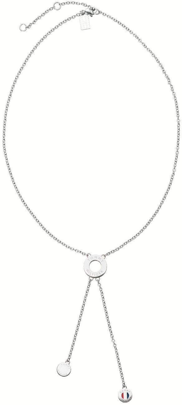 Naisten tyylikäs Tommy Hilfiger 2700498 kaulakoru. Koru on valmistettu ruostumattomasta teräksestä ja on hopean värinen. Ketjun pituudet ovat 43cm, 46,5cm ja 49cm. Riipusosien pituudet ovat 6,5cm ja 4,5cm. Ympyrän halkaisija, josta riipusosat lähtevät, on 1,5cm. Koru toimitetaan valmistajan alkuperäisessä rasiassa.