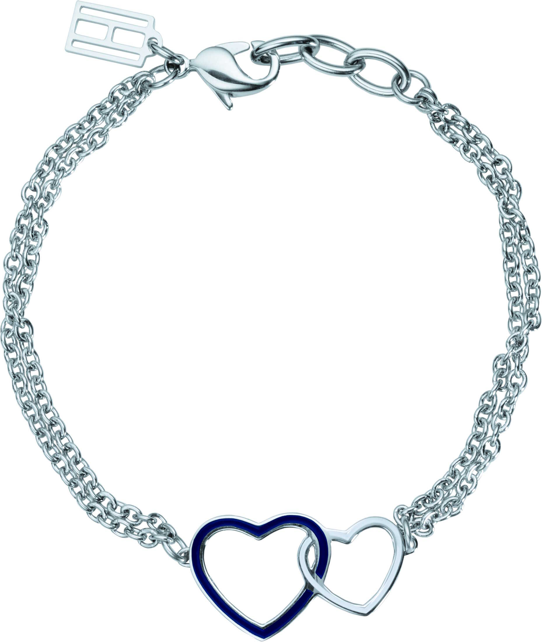 Naisten tyylikäs Tommy Hilfiger 2700512 rannekoru. Koru on valmistettu ruostumattomasta teräksestä ja on hopean värinen. Korun pituus on 18,5cm. Sydänosan pituus on 2,5cm. Isompi sydän on sininen ja pienempi valkoinen. Koru toimitetaan valmistajan alkuperäisessä rasiassa.
