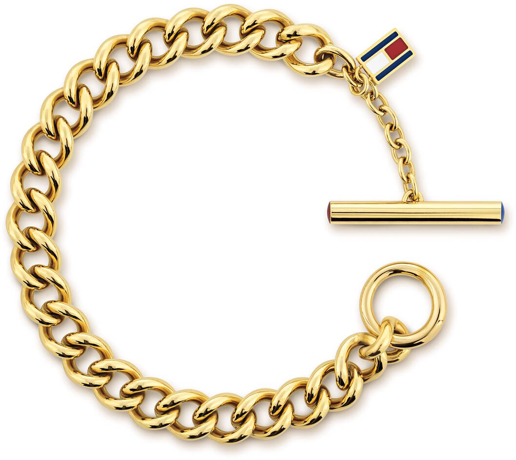 Tommy Hilfiger THJ2701051-rannekoru on kiiltävä ja näyttävä. Koru on valmistettu kullan väriseksi pinnoitetusta ruostumattomasta teräksestä. Korussa on myös pieni Hilfiger-logoriipus koristeena. Korussa on T-lukitus ja sen kokonaispituus on 17,5cm. Tommy Hilfiger -korut toimitetaan valmistajan alkuperäisessä pakkauksessa.