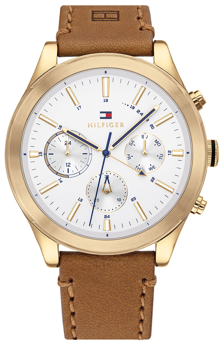 Tommy Hilfiger Ashton 1791742 on tyylikäs miesten rannekello. Multifunction-kellona tämä TH 1791742 Ashton näyttää 12/24 h ajan lisäksi myös viikonpäivän ja päivämäärän. Kellossa on 44 mm leveä kullanvärinen ruostumattomasta teräksestä valmistettu runko. Kiinnityskohdasta 21 mm leveä ranneke on kellanruskeaa nahkaa. Kokonaisuuden kruunaa tyylikäs valkohopea sunray-kellotaulu.