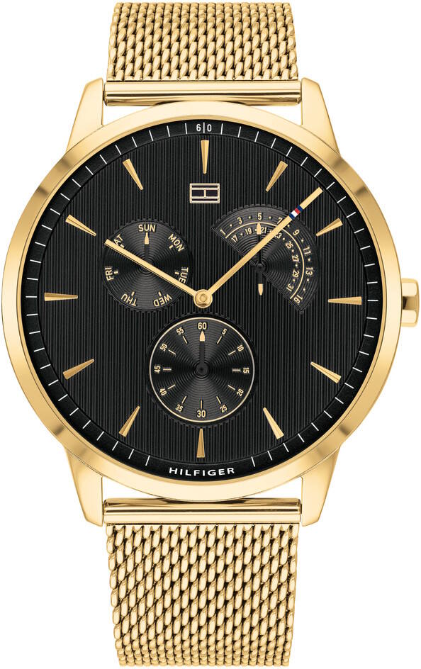Tommy Hilfiger Brad 1710386 -kelloon näyttävän kontrastin luovat musta kellotaulu ja kullanvärinen mesh-teräsranneke. Ominaisuuksina päivyri sekä viikonpäivänäyttö. Kellon rungon halkaisija on 44mm ja paksuus 9,8mm. Rannekkeen leveys kiinnityskohdasta on 22mm.