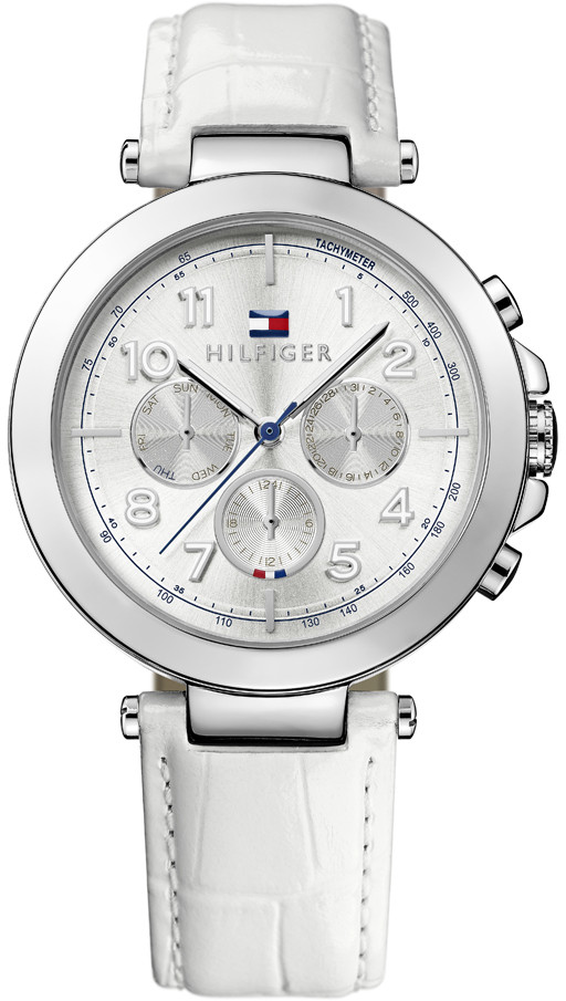 Naisten Tommy Hilfiger Cary 1781448 rannekello. Runko on valmistettu ruostumattomasta teräksestä ja se on hopean värinen. Rungon leveys on 40mm sekä valkoisen nahkarannekkeen leveys on 19mm. Kellossa on myös päivyri, multifunction ominaisuus sekä 24h-näyttö. Tommy Hilfiger kelloille myönnetään 2 vuoden takuu ja ne toimitetaan valmistajan alkuperäisessä rasiassa.