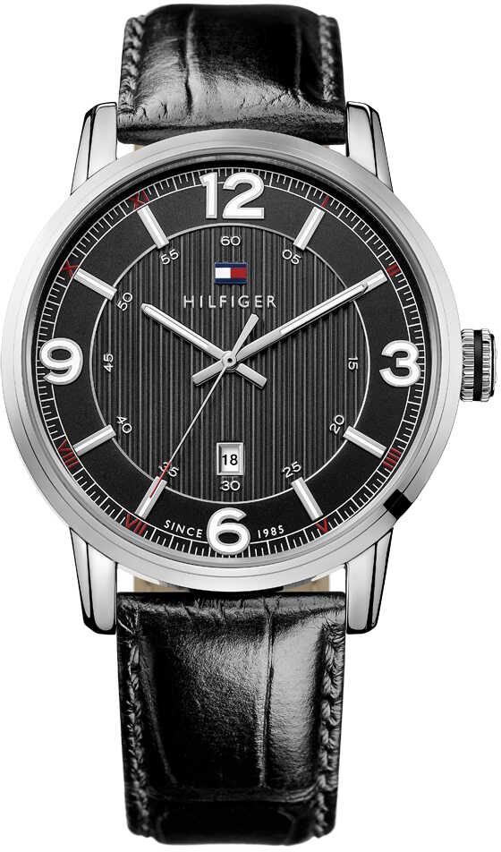 Miesten klassisen tyylikäs Tommy Hilfiger George 1710342 rannekello. Hopean sävyisen, ruostumattomasta teräksestä valmistetun rungon leveys on 43mm. Mustan nahkarannekkeen leveys on 19mm. Kellossa on myös päivyri.Tommy Hilfiger kelloille myönnetään 2 vuoden takuu ja ne toimitetaan valmistajan alkuperäisessä rasiassa.