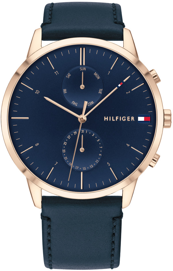 Tommy Hilfiger Hunter 1710405-pukukellossa on kaikille Hilfiger-faneille tuttu laivastonsininen yhdistetty vaaleaan kultaan. Kellossa on 44 leveä ruostumaton teräsrunko, ja kellon ominaisuuksiin kuuluu päivyri ja viikonpäivänäyttö. 22 mm leveä nahkaranneke on säädettävissä 15,5-21,5 cm pituuteen. Tommy Hilfiger-kelloilla on 2 vuoden takuu, ja ne toimitetaan valmistajan alkuperäisessä rasiassa.