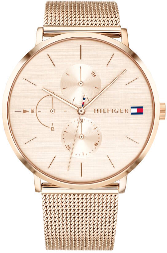 Tommy Hilfiger Jenna 1781944 -rannekello kädessäsi olet aina juhlien ykköstähti. Kuin suoraan punaiselta matolta napattuna tämä kello tihkuu glamouria ja tekee jokaisesta päivästäsi astetta näyttävämmän. Punakullan värinen 1781944 -malli on valmistettu ruostumattomasta teräksestä ja sen trendikästä kellotaulua suojaa mineraalilasi. Kellon rungon halkaisija on 40 mm, rannekkeella puolestaan on leveyttä 20 mm. Lisäominaisuutena kätevä päivyri.
