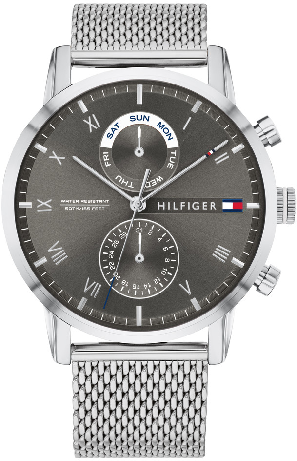 Tommy Hilfiger Kane TH1710402 on suunniteltu mukavuus silmälläpitäen. Kellossa on ohut ranteeseen mukautuva teräsmesh-ranneke ja pyöreä laakearunkoinen teräsrunko. Suuri tummanharmaa sunray-taulu on paitsi tyylikäs myös helppolukuinen, ja siinä on erilliset näytöt viikonpäiville ja päivämäärälle, joita on helppo säätää rungon painikkeista. Taulu on somistettu valkoisilla yksityiskohdilla, ja ohuet teräsosoittimet ja roomalaiset indeksit viimeistelevät kellon ilmeen. Rungon leveys on 44 mm, paksuus 11 mm ja rannekkeen kiinnityskohdan leveys on 22 mm, ja pituus 16-21,5 cm. Tommy Hilfiger -kelloilla on 2 vuoden takuu, ja ne toimitetaan valmistajan alkuperäisessä rasiassa.