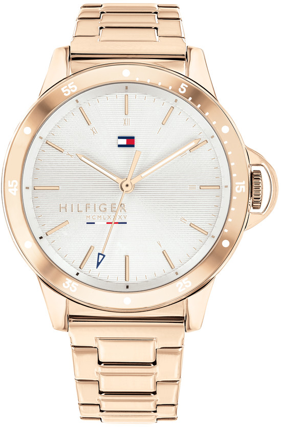 HUOM. Lukossa hiusnaarmuja, huomioitu hinnassa. Punakullan värinen Tommy Hilfiger Ladies Diver 1782024 mukailee ulkonäöltään aitoa sukeltajankelloa. Teräksinen 38 mm runko kulkee kokonaan säätönupin yli ja viisareista löytyy lisäksi laadukas luminointi. 18 mm ranneke toimii kätevästi linkkulukolla.