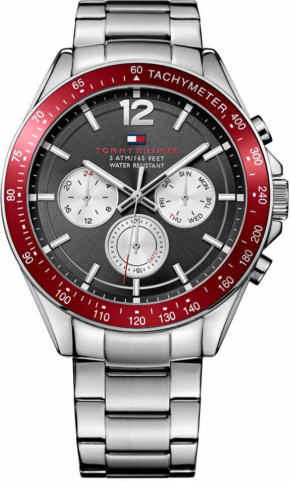 Tommy Hilfiger Luke 1791122 on näyttävä miesten kello hopean värisellä rungolla ja punaisella kellotaulun kehällä. Ominaisuuksina päivyri, viikonpäivänäyttö sekä 24h näyttö. Kellon rungon leveys 46 mm ja rungon paksuus 12 mm. Metallirannekkeen leveys on 22 mm. Tommy Hilfiger kellot toimitetaan valmistajan alkuperäisessä rasiassa ja niille myönnetään 2 vuoden takuu.