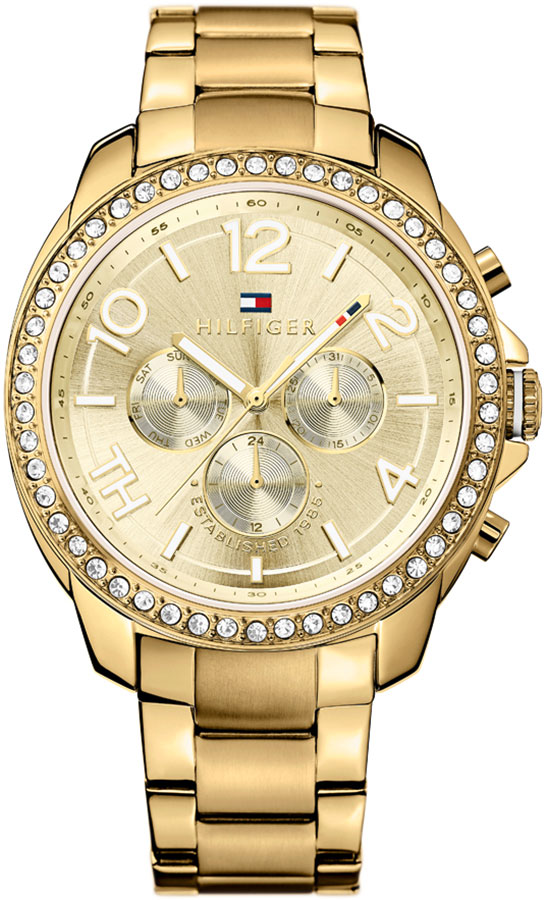 Naisten tyylikäs Tommy Hilfiger Serena 1781465 rannekello. Runko ja ranneke on valmistettu ruostumattomasta teräksestä ja ovat kullan väriset. Rungon leveys on 42mm ja rannekkeen 18mm. Taulun ulkokehälle on upotettu zirkonia-koristekiviä. Tommy Hilfiger kelloille myönnetään 2 vuoden takuu ja ne toimitetaan valmistajan alkuperäisessä rasiassa.