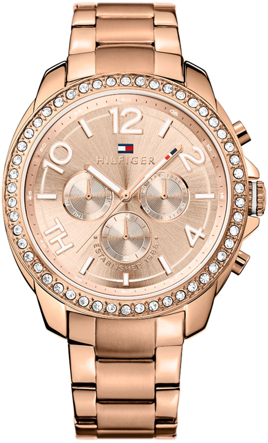 Naisten tyylikäs Tommy Hilfiger Serena 1781466 rannekello. Runko ja ranneke on valmistettu ruostumattomasta teräksestä ja ovat punakullan väriset. Rungon leveys on 42mm ja rannekkeen 18mm. Taulun ulkokehälle on upotettu zirkonia-koristekiviä. Tommy Hilfiger kelloille myönnetään 2 vuoden takuu ja ne toimitetaan valmistajan alkuperäisessä rasiassa.