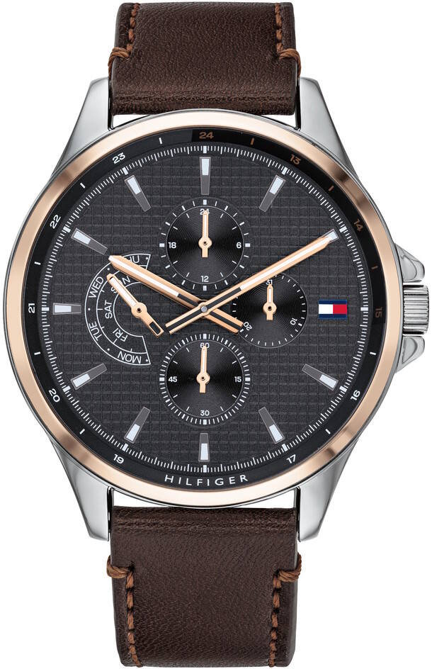 Tommy Hilfiger Shawn 1791615 -kellossa on harmaa kellotaulu, punakullan värinen kellotaulun kehä sekä ruskea nahkaranneke. Ominaisuuksina päivyri, 24h-näyttö sekä viikonpäivänäyttö. Kellon rungon halkaisija on 44mm ja paksuus 9,5mm. Rannekkeen leveys kiinnityskohdasta on 21mm ja rannekkeessa on kätevä solkilukko.