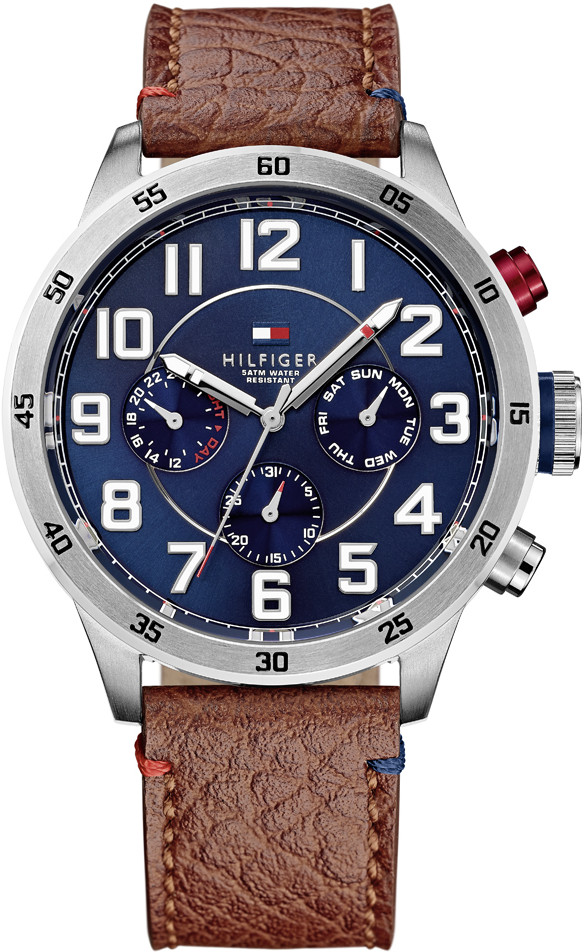 Miesten Tommy Hilfiger Trent 1791066 rannekello. Runko on valmistettu ruostumattomasta teräksestä ja väriltään se on hopeinen. Rungon leveys on 46mm ja ruskean nahkarannekkeen leveys on 22mm. Kellossa on myös päivyri, multifuction ominaisuus sekä 24h-näyttö. Tommy Hilfiger kelloille myönnetään 2 vuoden takuu ja ne toimitetaan valmistajan alkuperäisessä rasiassa.