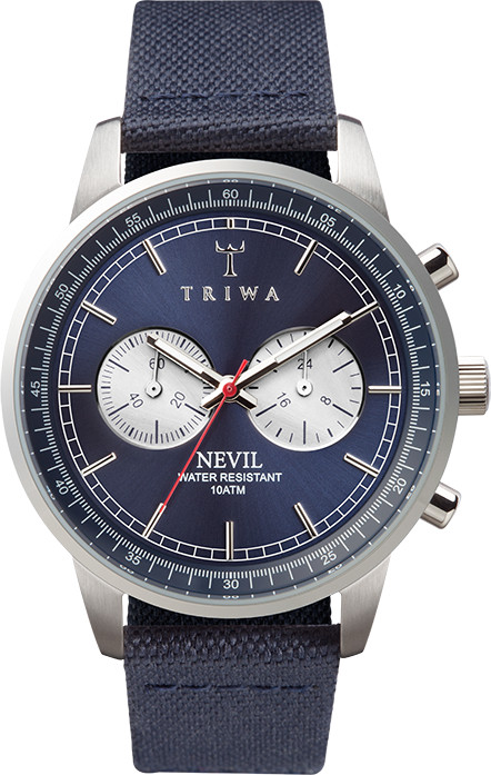 Triwa Blue Steel Nevil Navy Classic Canvas NEST108 rannekello. Kellon rungon leveys 42mm ja rannekkeen 20mm. Kellon koneisto on japanilainen Miyota OS-21. Kellossa ajanotto-ominaisuus. Kello toimitetaan valmistajan alkuperäisessä lahjarasiassa postikuluitta! Triwa kelloille myönnetään 2 vuoden takuu.