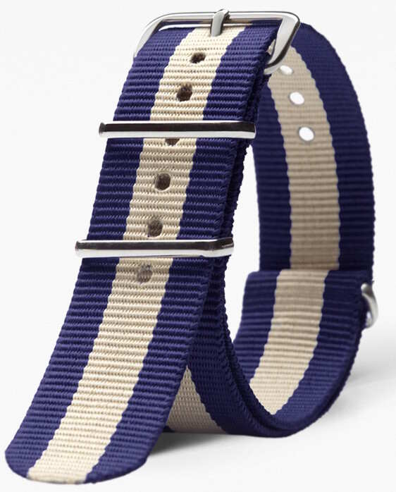 Triwa Blue Stripe Nato ranneke STNY126 on keskeltä beigen värinen ja laidoilta tummansininen. Rannekeen leveys 20mm.