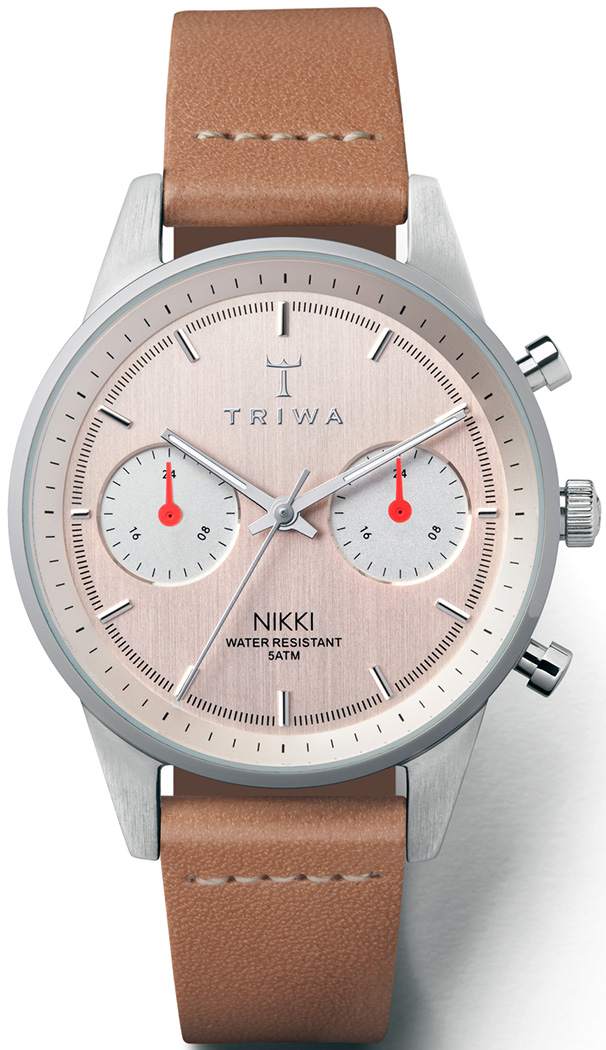 Triwa Blush Nikki NKST105-SS010612 -kellossa on hento vaaleanpunainen metallinhohtoinen kellotaulu. Kellon ruskea ranneke on aitoa nahkaa joka on valmistettu ja värjätty orgaanisesti Ruotsissa, Tärsnsjö Garverin nahkaamossa. Ominaisuutena kellossa on kaksoisaika ja 24-näyttö. Kellon rungon leveys on 36mm ja paksuus 9,5mm. Rannekkeen leveys kiinnityskohdasta on 16mm. Triwa- kelloille myönnetään 2 vuoden takuu ja ne toimitetaan valmistajan alkuperäisessä rasiassa.