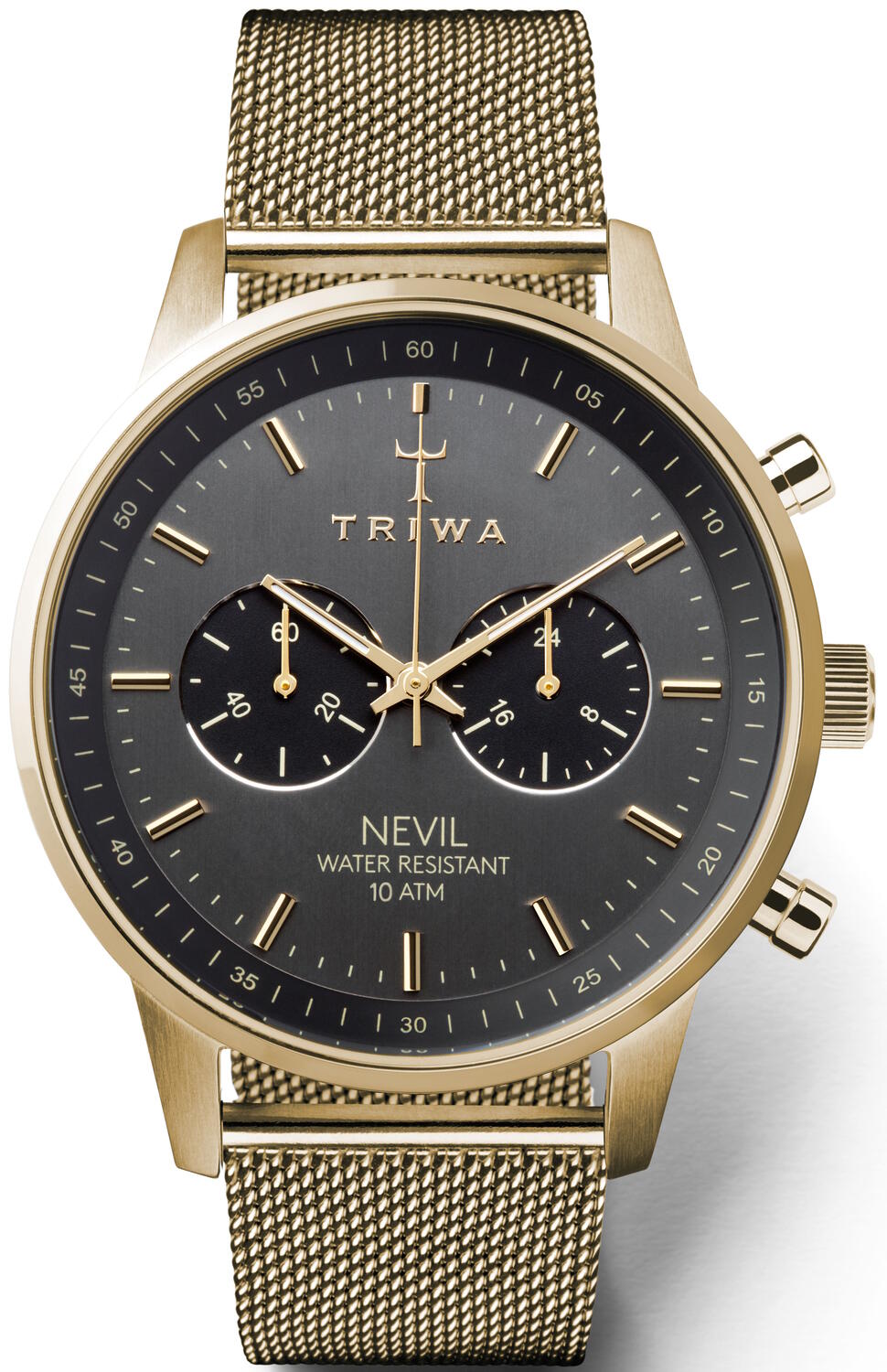 Triwa Somky Nevil Gold NEST117-ME021313 on uudelleentulkinta perinteisestä kronografikellosta. Kellossa on kaunis tummanharmaa kellotaulu ja kaksi erillistä näyttöä ajanotolle ja 24 tunnin kellolle. Kellon runko ja ranneke ovat kulluväriset. Rungon leveys on 42 mm ja paksuus 12 mm. Kellon ranneke on leveydentään 20mm kiinnityskohdsasta Triwa-kelloilla on kahden vuoden takuu, ja ne toimitetaan valmistajan alkuperäisessä pakkauksessa.