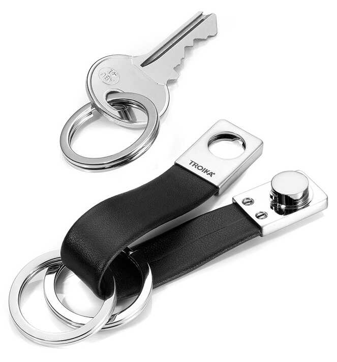 Troika KRG649/LE nahkalenkkiavaimenperään on helppo vaihtaa avaimenperärenkaita pois ja takaisin. Avaimenperässä on kolme avaimenperärengasta. Avaimenperän mitat ovat 75 x 19 x 9 mm ja sen paino on 30 g. Tuote sisältää valmistajan alkuperäisen kotelon.