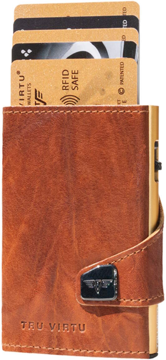 Tru Virtu Click & Slide Caramba Brown-Yellow on tyylikäs korttikotelo, joka on valmistettu laadukkaasta italialaisesta nahasta. Tru Virtu click & slide -lompakoissa käytetään innovatiivista ja patentoitua "Click & Slide" -teknologiaa. Peukalon työnnöllä korttisi pomppaavat ulos alumiinikotelosta porrastetusti ja saat kätevästi poimittua oikean kortin. Alumiinikotelo suojaa kortteja myös etäluennalta. Lompakko on kiedottu italialaiseen nahkaan, joka aukeaa napin avauksella seteli- ja korttitaskuksi, joten myös setelit ja kuitit kulkevat kätevästi mukana. Lompakon paksuus on 21mm ja korkeus 99mm. Alumiinikoteloon mahtuu 5 korttia ja avautuvaan nahkataskuun saat mahtumaan 4 korttia lisää.