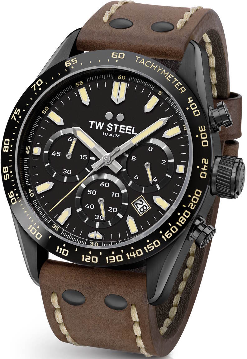 TW Steel Chrono Sport CHS1 on retrohenkinen ja erittäin energinen miesten rannekello. Kellossa on ruskea nahkaranneke ja musta runko. Kellon kehää kiertää PVD-pintainen musta takometri. 46 mm runko on valmistettu ruostumattomasta teräksestä ja se kestää mainiosti myös uimista. Laadukkaita yksityiskohtia tässä mallissa ovat lisäksi heijastamaton safiirilasi ja kierrettävä säätönuppi. Kellotaulusta löydät niin sekuntikellon taulut, päivyrin kuin viikonpäivän osoittimenkin.