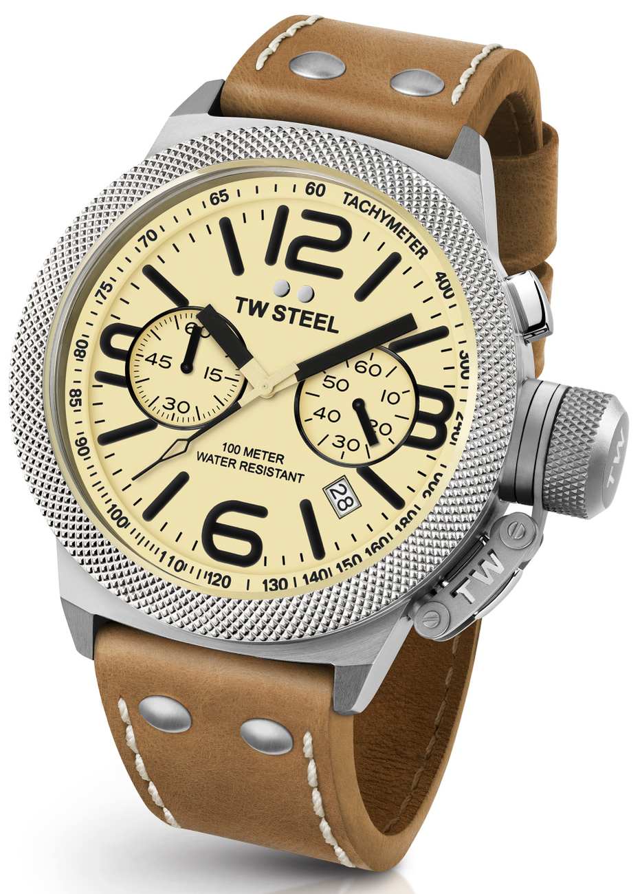 TW Steel CS14 Canteen Leather mallissa on luonnonvalkoinen kellotaulu ja ruskea nahkaranneke. Kellon rungon leveys on 50mm, paksuus 15mm ja rannekkeen leveys 24mm. TW Steel kelloille myönnetään 2 vuoden takuu ja ne toimitetaan valmistajan alkuperäisessä rasiassa!