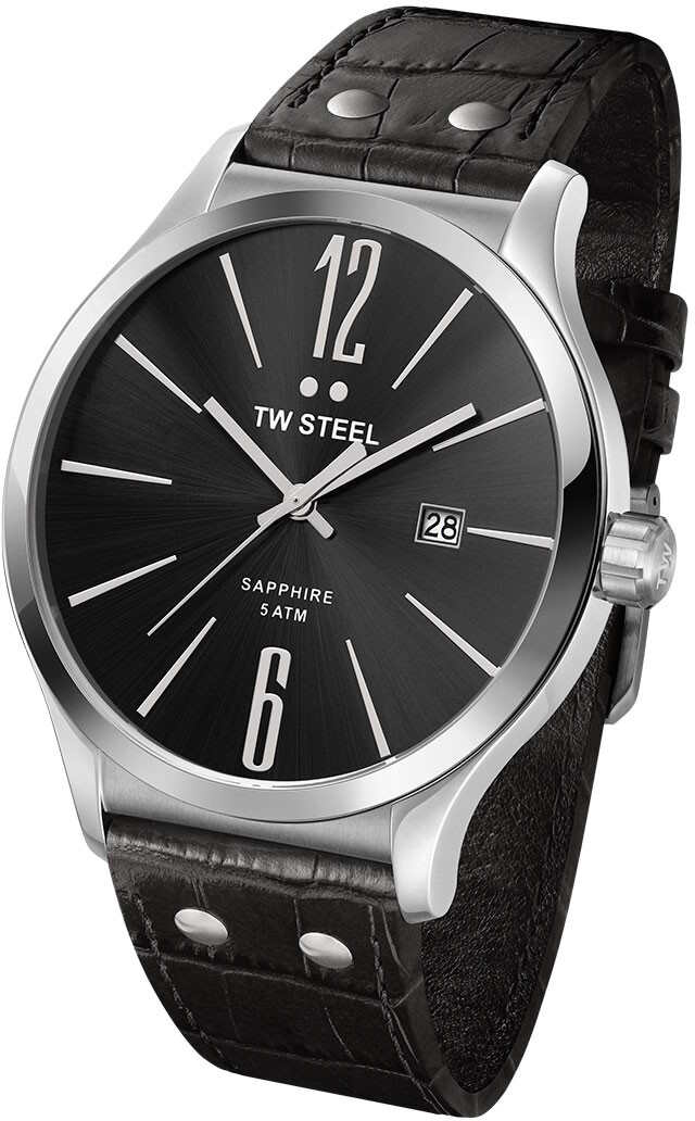 Miesten tyylikäs TW Steel Slim Line TW1300 rannekello. Kellon hopean värisen rungon leveys on 45mm ja se on valmistettu ruostumattomasta teräksestä. Mustan nahkarannekkeen leveys on 20mm. Kellossa on myös päivyri ja safiirilasi. TW Steel kelloille myönnetään 2 vuoden takuu ja ne toimitetaan valmistajan alkuperäisessä rasiassa.