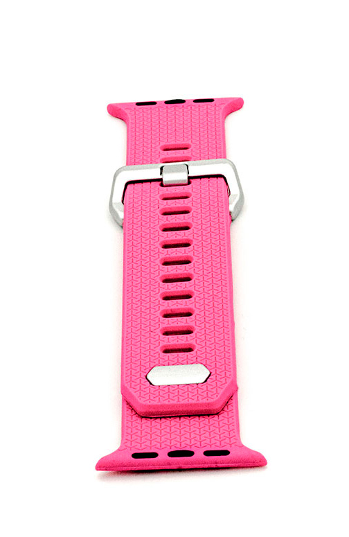 Vaaleanpunainen 38/40/41 mm silikoniranneke on tukevaa kuvioitua silikonia, ja se sopii Apple Watch-kelloihin, joissa on 38/40/41 mm rungon leveys. Ranneke on rei'itetty, jonka johdosta se ei hiosta ranteessa, ja ranneke on helppo kiinnittää Apple Watchin rungon uraan leveällä kiinnikkeillä. Säätö omaan ranteeseen tapahtuu solkilukolla. Solki on ruostumatonta terästä. Rannekkeen leveys 22 mm, ja se sopiii max. 21 cm ranteisiin.