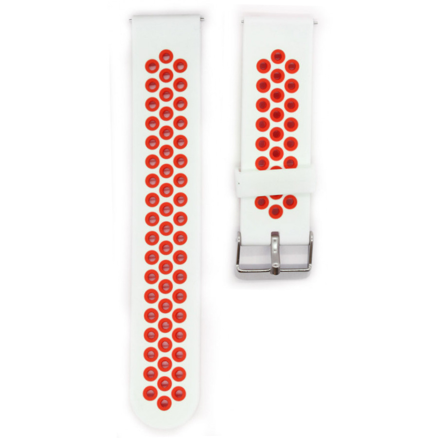 Tämä valko-punainen silikoniranneke on ihoystävällinen ja hengittää hyvin. Sporttinen ulkonäkö on omiaan tuomaan uutta ilmettä kelloosi. Rannekkeessa on pikakiinnitys, jonka ansiosta vaihto sujuu käden käänteessä.