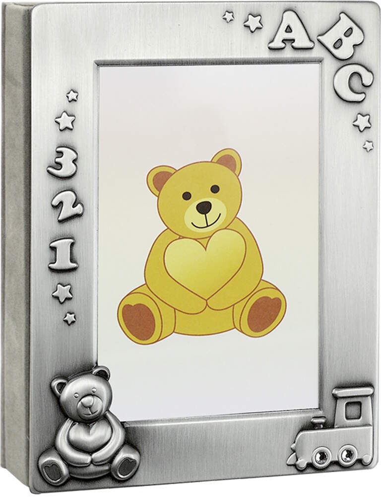 Materiaali: Harmaa nukkakangas tausta ja tinapinta Mitat:140x40x190 mm Kuvat: Nalle, juna, numeroita & aakkosia Kuvakoko: 10x15 cm