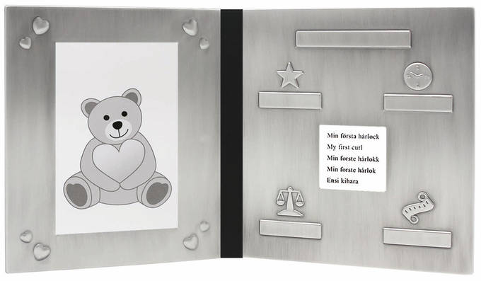 Valokuvakehys Kaste ja Ensikihara 078596. Kehyksessä on paikka (4x4cm), johon voi laittaa lapsen ensimmäisen hiuskiharan. Kehys sopii sekä tyttö- että poikavauvan kuvalle.