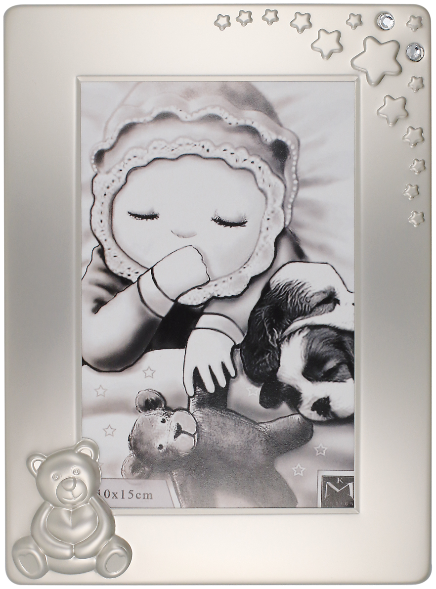 Valokuvakehys Sydännalle 078561. Kehyksessä on jalka, joten se on mahdollista laittaa esimerkiksi vitriiniin esille. Kehys sopii sekä tyttö- että poikavauvan kuvalle.