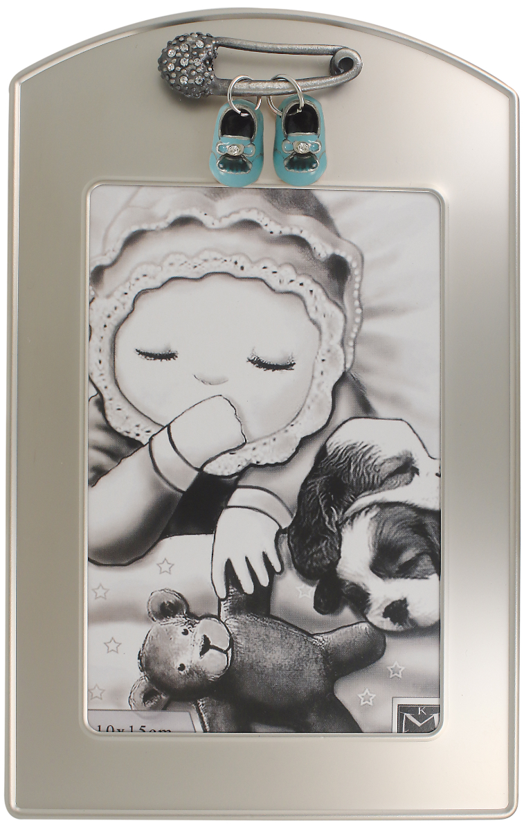Valokuvakehys Vaaleansiniset tossut 078611. Kehyksessä on jalka, joten se on mahdollista laittaa esimerkiksi vitriiniin esille. Kehys sopii erityisesti poikavauvan kuvalle.