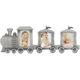 Valokuvakehys Veturi ja Vaunut 078597. Kehyksessä on jalka, joten se on mahdollista laittaa esimerkiksi vitriiniin esille. Kehys sopii erityisesti poikavauvan kuville.