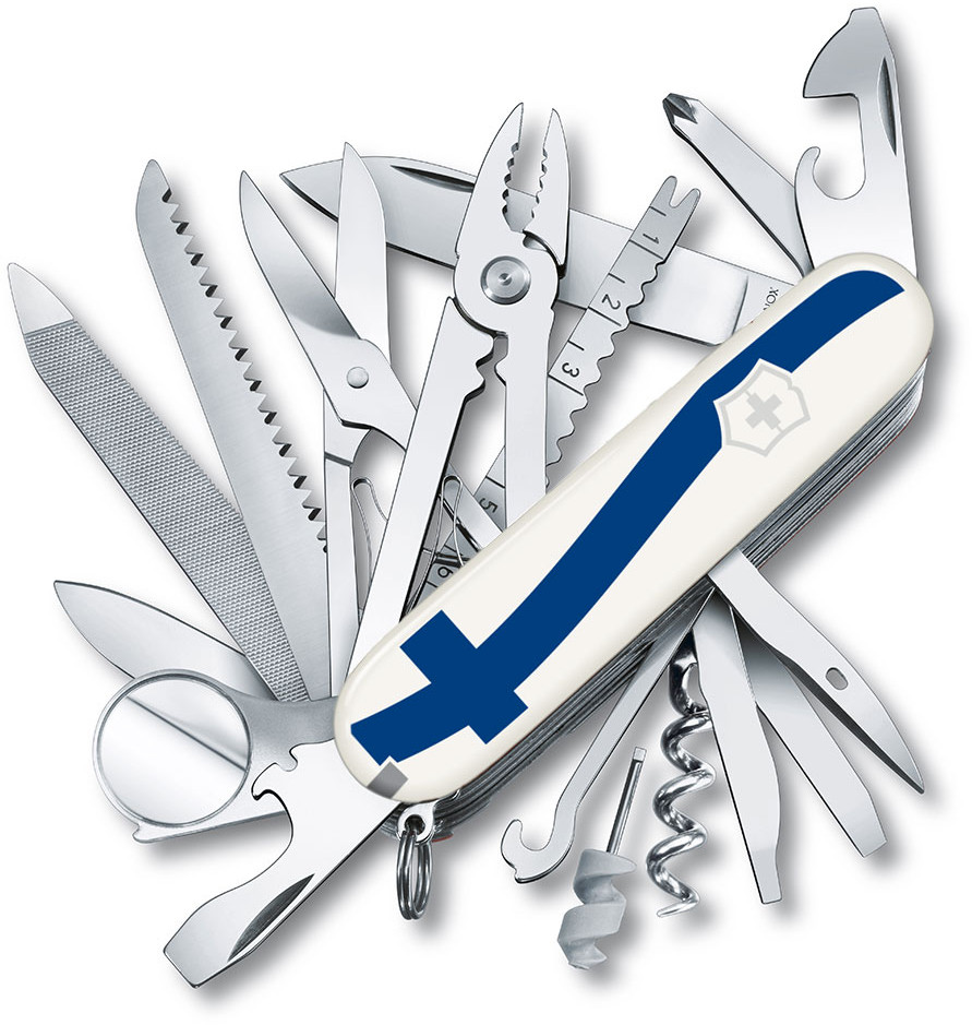 Victorinox 1.6795.7R2 Swiss Champ Jubileum Edition on kestävä ja monipuolinen linkkuveitsi, joka sisältää 32 ominaisuutta. Tämän suomen lipun väreillä koristeltu linkkuveitsi on valmistettu Suomi 100 vuotta juhlavuoden kunniaksi. Elinikäinen takuu materiaali- ja valmistusvirheiden varalta. Tuote toimitetaan valmistajan alkuperäisessä pakkauksessa.