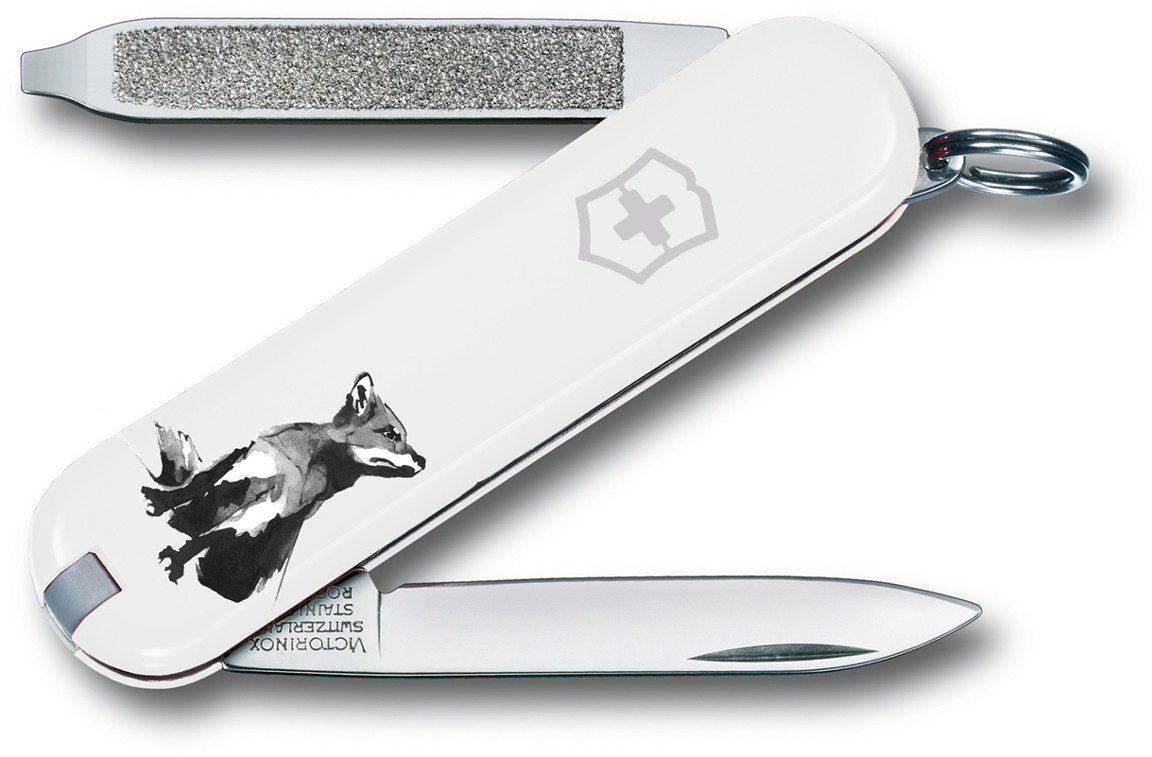 Victorinox Kettu by Teemu Järvi 0.6123.7R-TJ1B on puhtaan valkoinen linkkuveitsi, jonka kyljestä löytyy viekkaan ketun kuva. Piirroksen takana on luontoaiheisista töistään tunnettu taiteilija ja muotoilija Teemu Järvi. Tämän linkkuveitsimallin pituus on vaivaiset 58 mm ja se sopiikin näin ollen mainiosti esim. avaimenperäksi. Alle 60 mm terän omaavana veitsen voi pakata huoletta myös käsimatkatavaroihin. Kaikille Victorinox-työkauluille myönnetään elinikäinen takuu valmistus- ja materiaalivirheiden varalle. Tuotteet toimitetaan valmistajan alkuperäisessä pakkauksessa.
