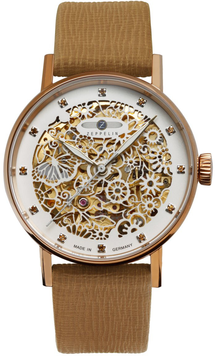 Zeppelin Princess of the Sky-mallisto hehkuu 1920-luvun tyyliä ja sopii tyylitietoiselle naiselle. Zeppelin Princess of the Sky Automatic 7463-5-naisten rannekellon kuvioitu taulu näyttää osaksi kellon kullanvärisen koneiston, ja myös kellon tausta on avoin paljasten 21-kivisen 8N24g-automaattikoneiston . Kellotaulu on koristeltu aidoin meripihkanvärisin Swarovskin kristallein, ja käsinvalmistettu vasikannahkaranneke viimeistelee kellon lämpimän ilmeen. Rungon leveys on 36 mm, rannekkeen kiinnityskohdan leveys on 18 mm ja ranneke on pituudeltaan 15,5-19,5 cm. Saksalaisvalmisteisilla Zeppelin-kelloilla on kahden vuoden takuu, ja ne toimitetaan valmistajan alkuperäisessä pakkauksessa.