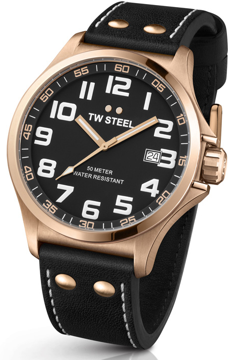 Miesten tyylikäs TW Steel Pilot TW417 punakullan värisellä rungolla ja mustalla nahkarannekkeella. Kellon rungon leveys on 48mm, paksuus 13mm ja rannekkeen leveys 24mm. TW Steel kelloille myönnetään 2 vuoden takuu ja ne toimitetaan valmistajan alkuperäisessä rasiassa postikuluitta!